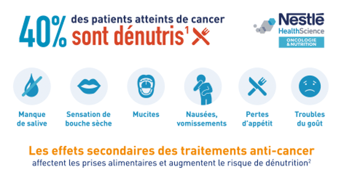 Parmi les patients atteints de cancer, 84% ont connu une perte de poids depuis le début de la maladie (1) et 40% sont dénutris (2). Alors que la nutrition a été reconnue comme soin de support, 40% des patients dénutris ne reçoivent aucun support nutritionnel (1).