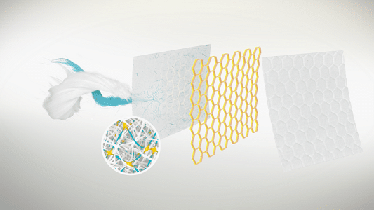 Biatain® Fiber est composé de fibres non tissées de carboxyméthylcellulose (CMC) sodique et de fibres bicomposant (BiCo) renforçant la structure. La technologie Hexalock® intègre ces fibres dans un filet hexagonal embossé, procurant à Biatain® Fiber la force d’absorber et retenir les exsudats (2,3).